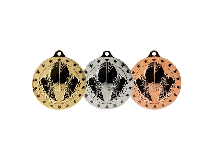 50mm stamped iron medal with a frosted 2-tone finish.