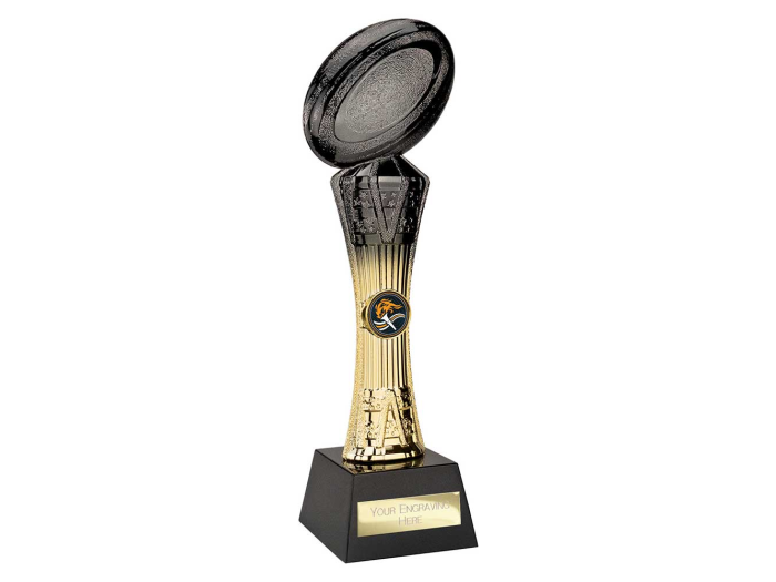 Tall trophy in carbob black and gold with a hard shell finish.